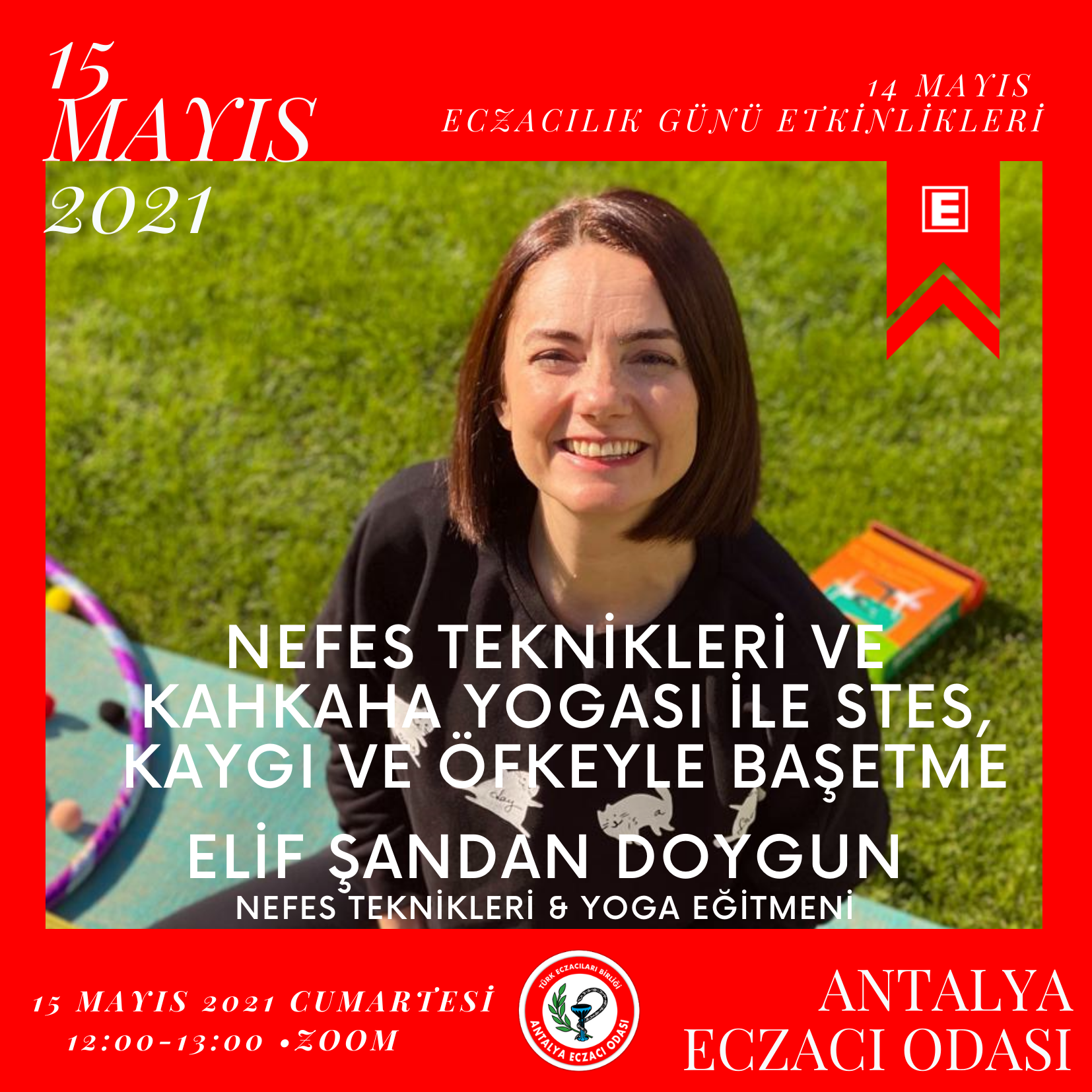Nefes Teknikleri ve Yoga Eğitmeni Elif Şandan Doygun ile Eczacılık Günü Etkinlikleri kapsamında, 15 Mayıs Cumartesi günü, doğru nefes, nefes teknikleri ve kahkaha yogası ile stres, kaygı ve öfkeyle baş etmenin yollarını öğreneceğimiz etkinliğimizde buluşuyoruz.