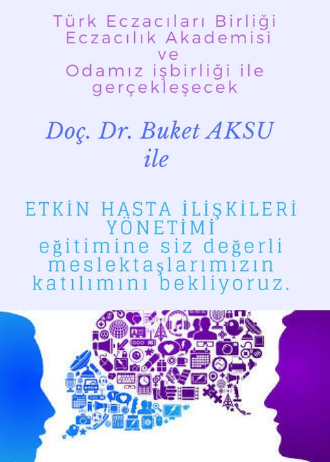 28 Şubat 2017 Salı günü 09.30- 17.00 saatleri arasında Muratpaşa Temsilciliğimizde (Meltem Büro) Türk Eczacıları Birliği Eczacılık Akademisi ve Odamız işbirliği ile , Doç Dr. Buket AKSU ( Kemerburgaz Üniversitesi Eczacılık Fakültesi ) 'nun konuşmacı olarak katılacağı "Etkin Hasta İlişkileri Yönetimi" konulu eğitim düzenlenmiştir.