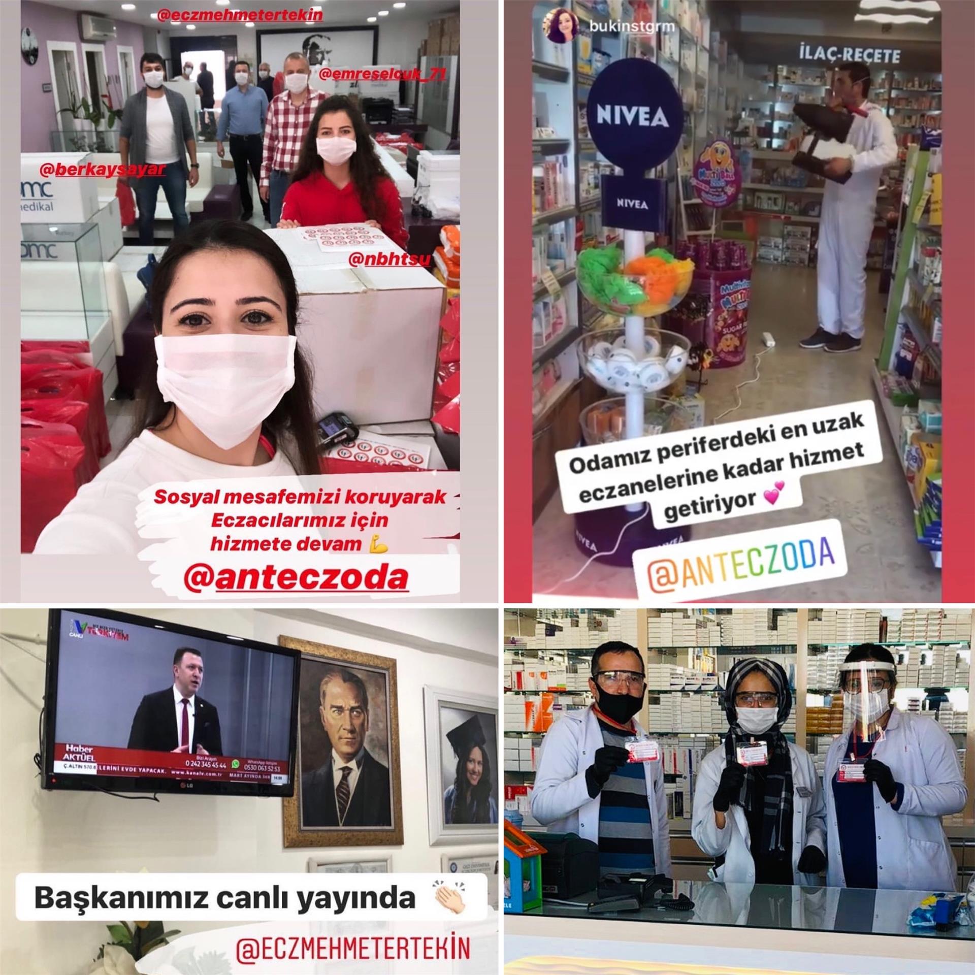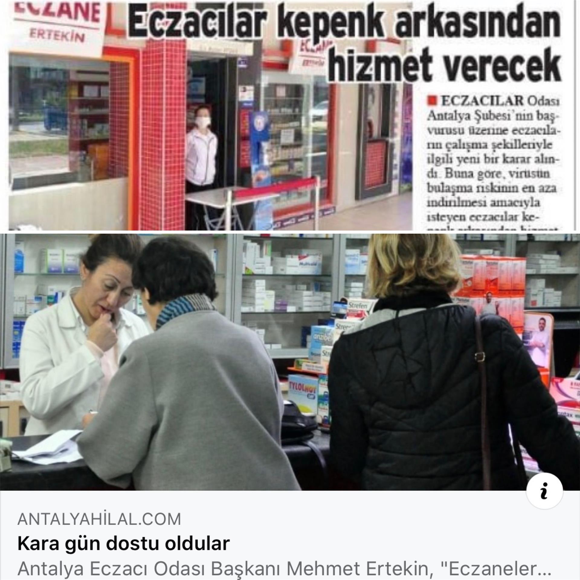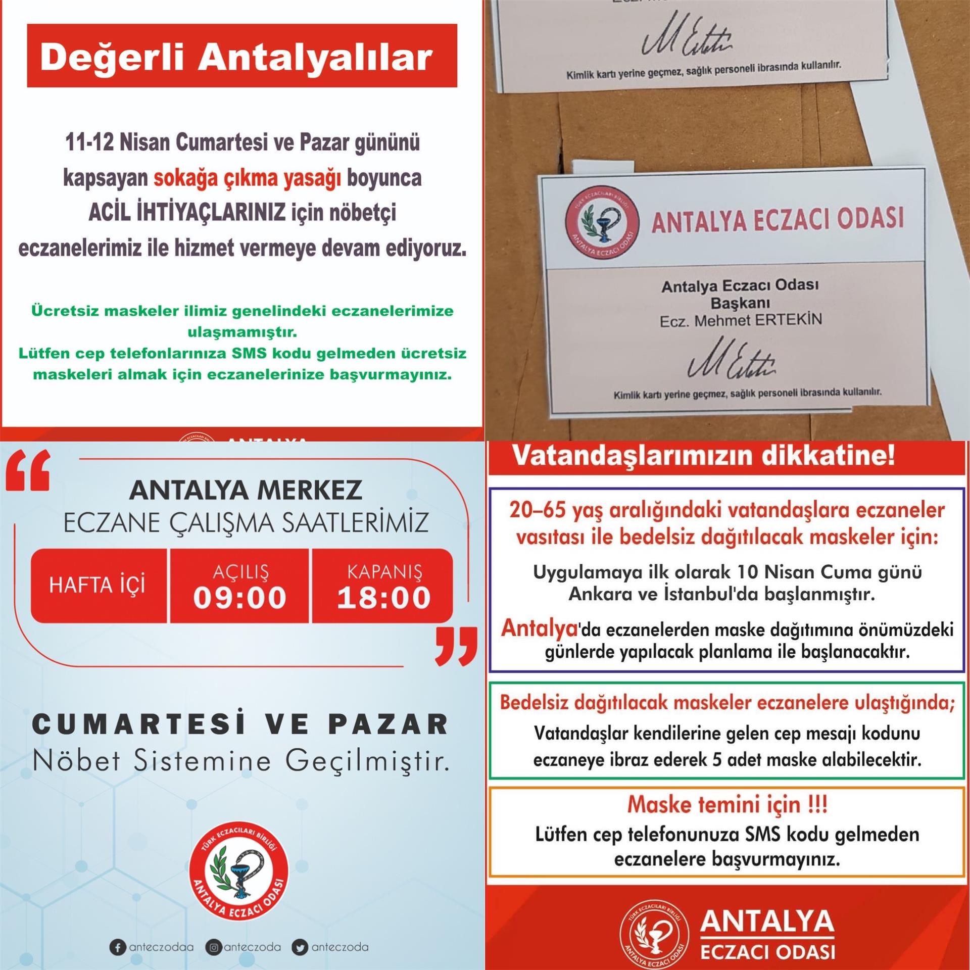 Covid-19 ile mücadele sürecinde Kaş-Kalkan dan Gazipaşa ilçemize kadar 450 km lik mesafede eczanelerimize hizmet ulaştırmaya ve meslektaşlarımızı korumaya yönelik çalışmalar yapmaya devam ediyoruz. İlimizde 1210 eczanemiz, kamu, özel hastane, depo eczacılarımız ve 3500 eczane çalışanımızla bu mücadelenin ön saflarındayız.