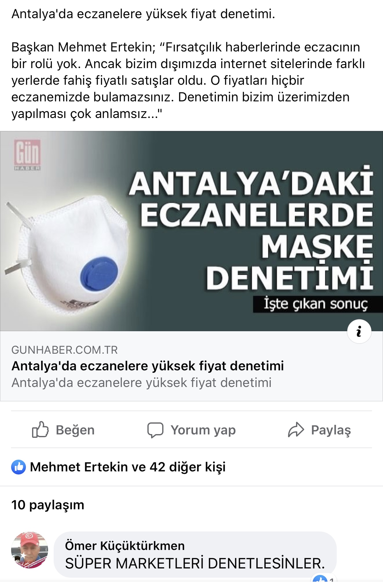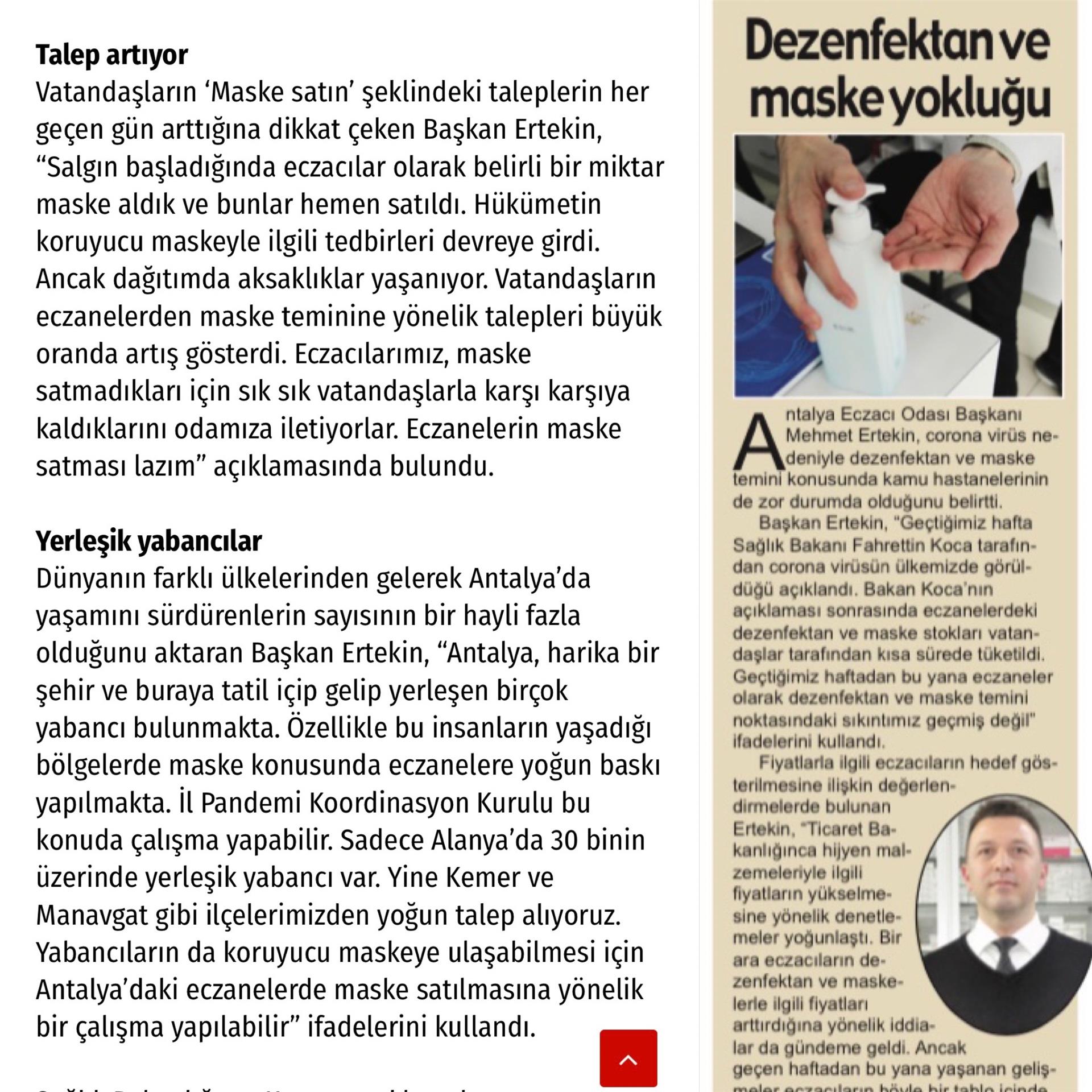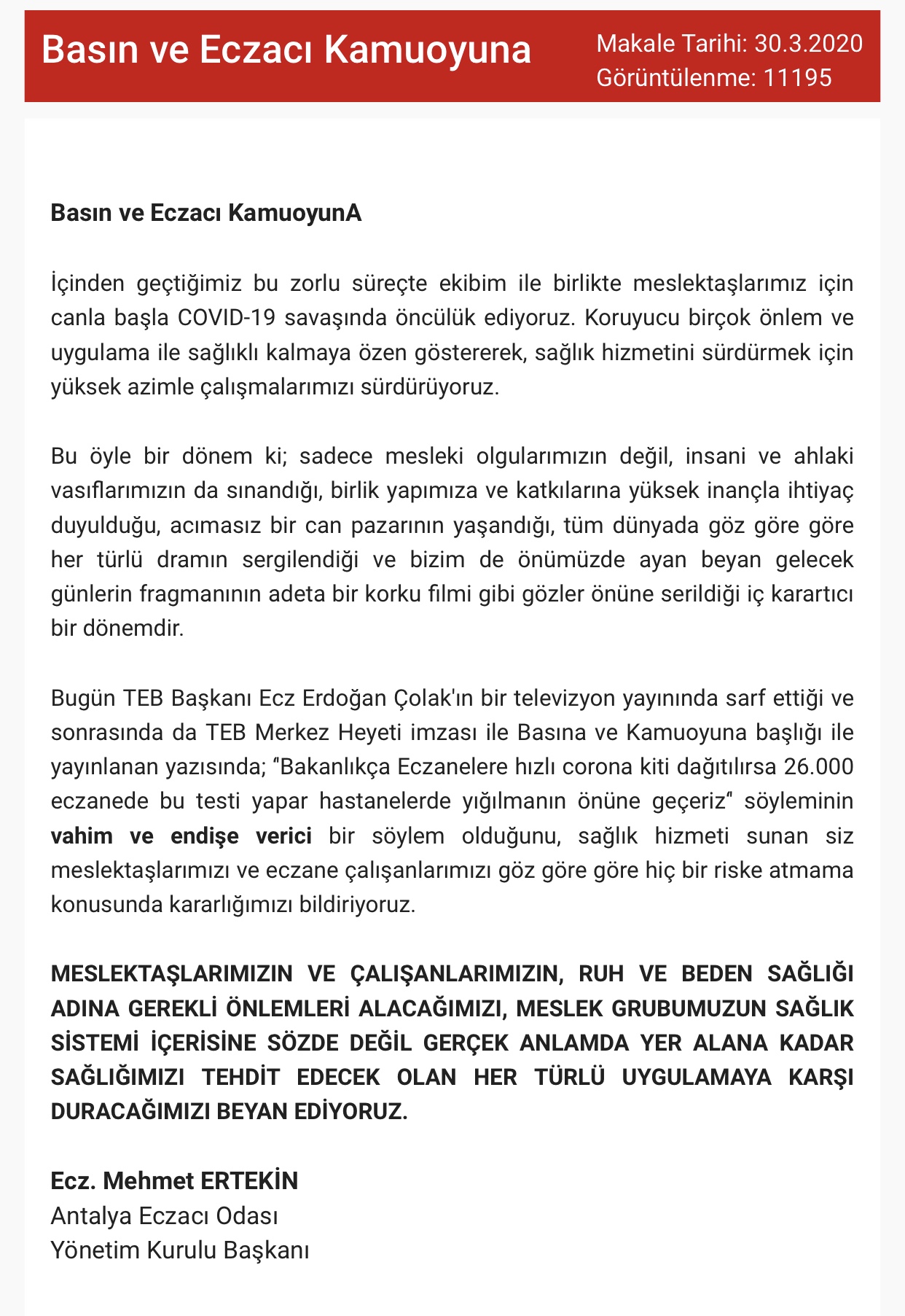 Covid-19 ile mücadele sürecinde Kaş-Kalkan dan Gazipaşa ilçemize kadar 450 km lik mesafede eczanelerimize hizmet ulaştırmaya ve meslektaşlarımızı korumaya yönelik çalışmalar yapmaya devam ediyoruz. İlimizde 1210 eczanemiz, kamu, özel hastane, depo eczacılarımız ve 3500 eczane çalışanımızla bu mücadelenin ön saflarındayız.