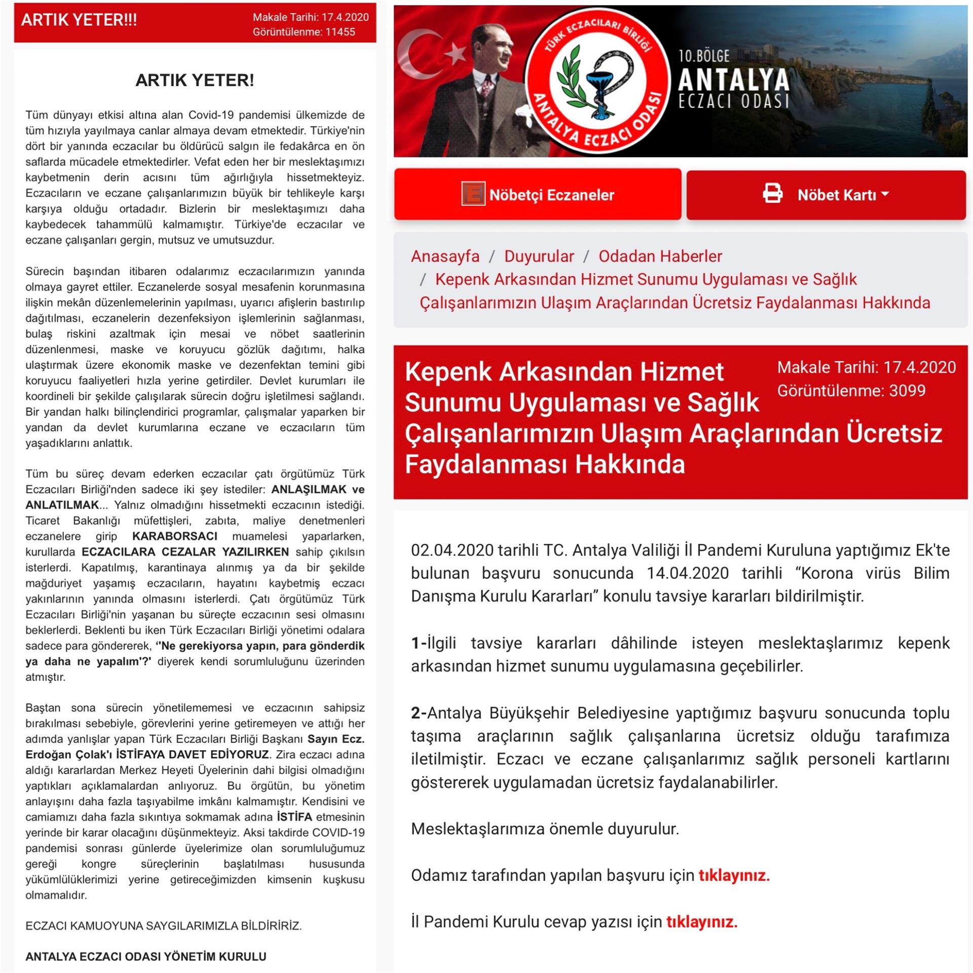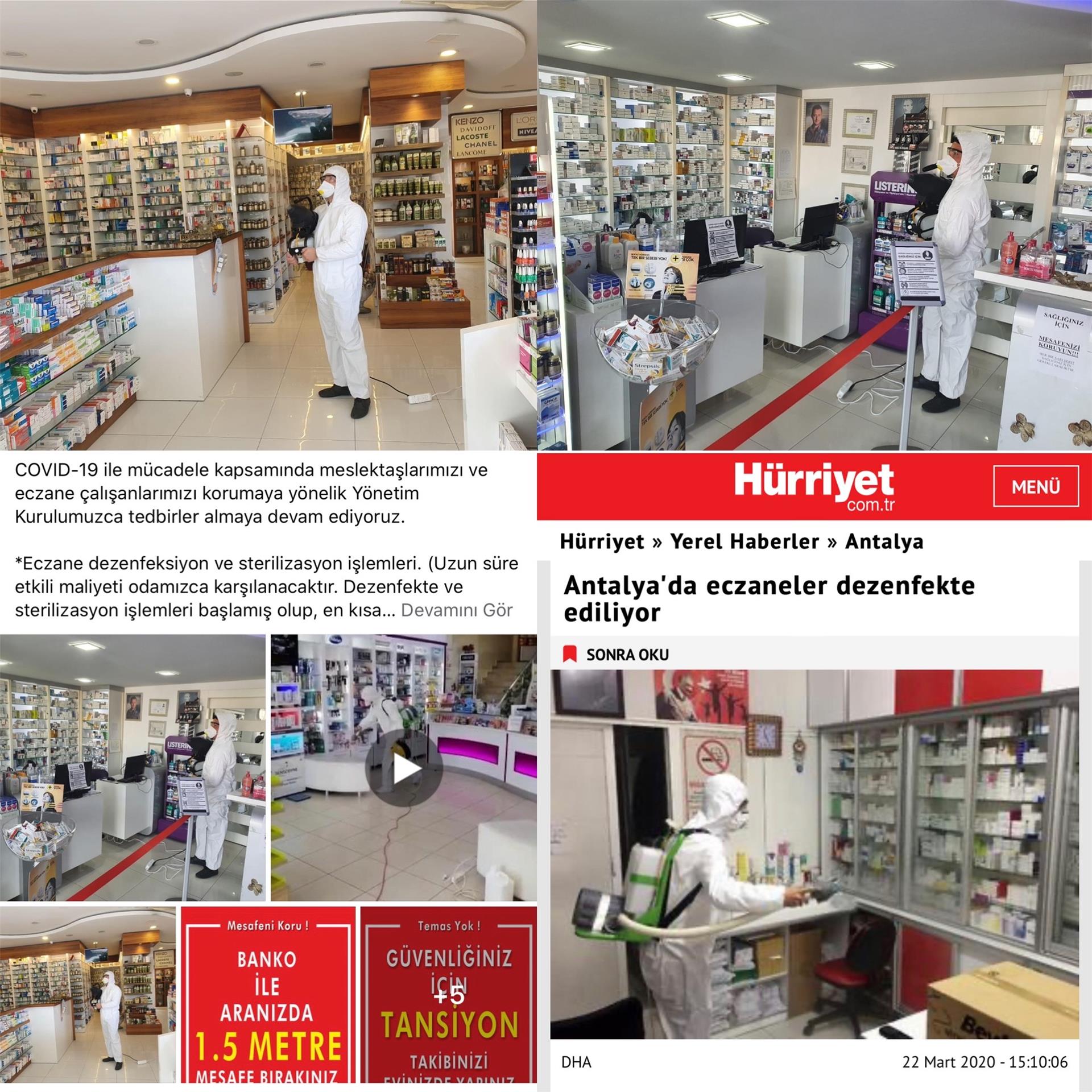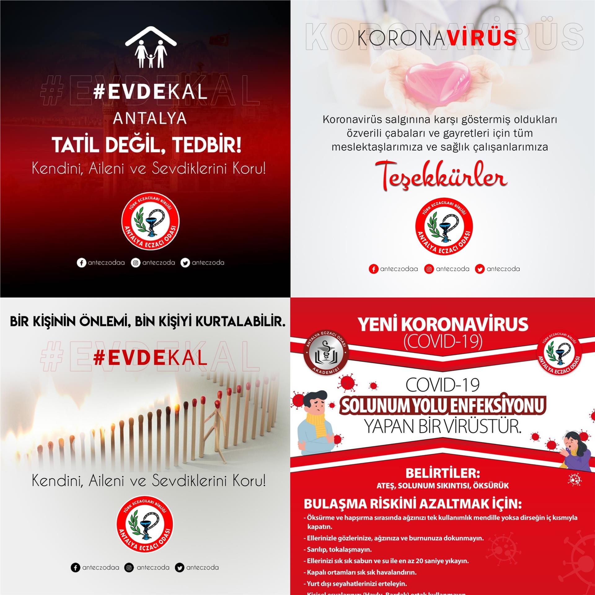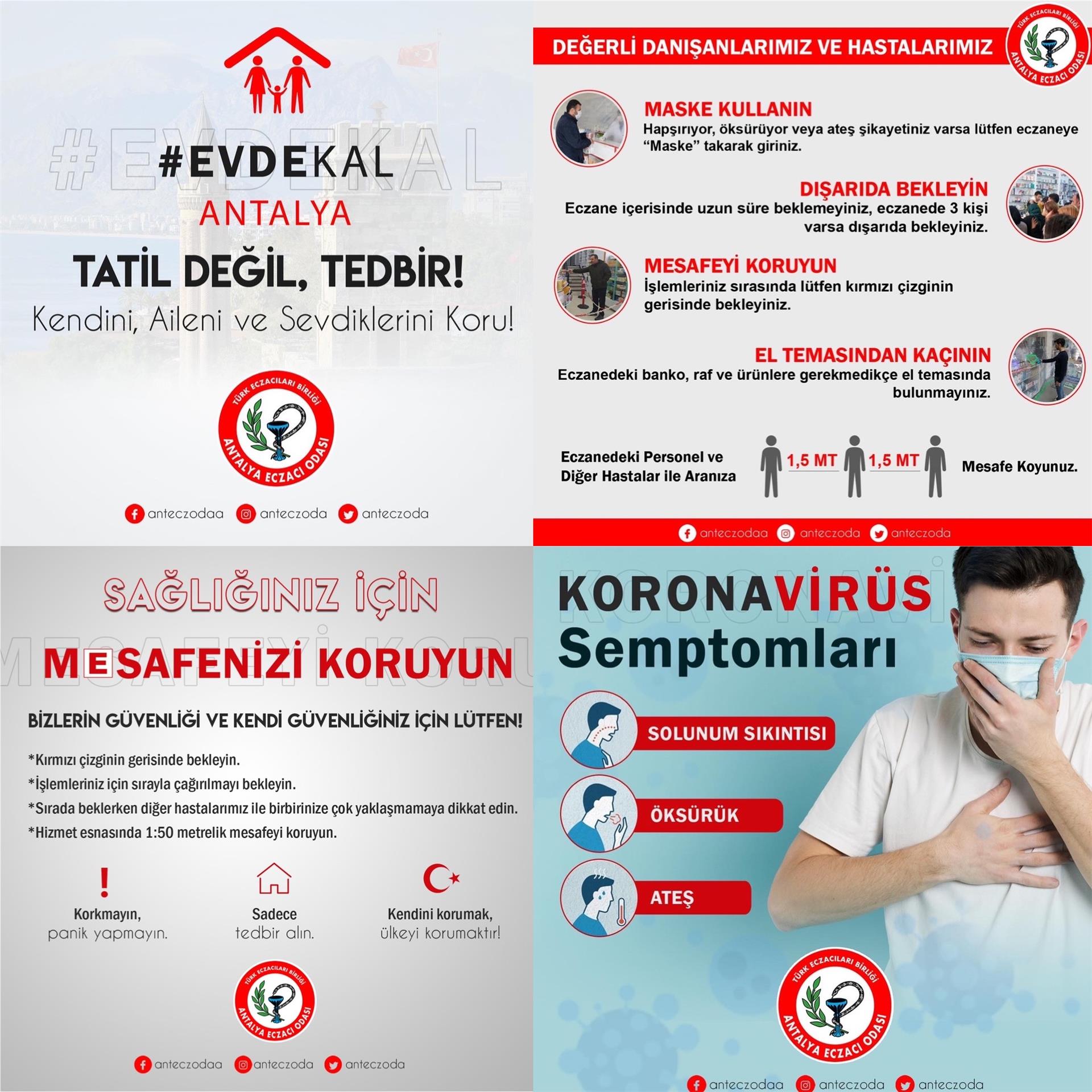 Antalya Eczacı Odası olarak sürecin başından itibaren meslektaşlarımızın hem sağlığının hem de maddi çıkarlarının korunması için çalışmalar yaptık. Bununla ilgili Antalya Valiliği, İl Pandemi Kurulu, İl Hıfzıssıhha Kurulu, Büyükşehir ve İlçe Belediyeleri ile sürekli görüşmeler halindeyiz. Bizlerin ve vatandaşlarımızın en az riske maruz kalmalarını sağlayan önlemler alıyoruz. Alınan ya da alınmasını talep ettiğimiz kararların uygulanmasında meslektaşlarımızın zarar görmemesi için çabalıyoruz.