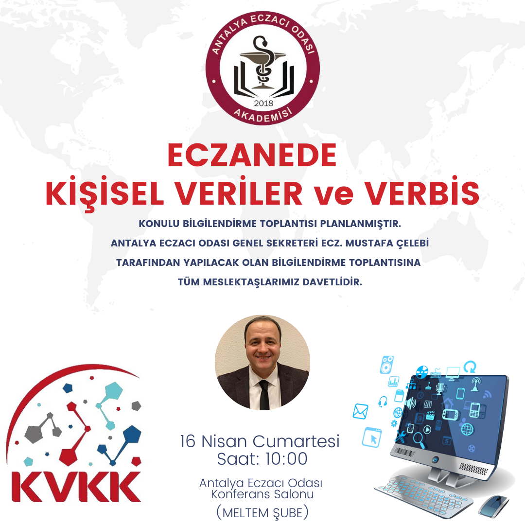 16/04/2022 Cumartesi günü Antalya Eczacı Odası Akademisi tarafından "ECZANEDE KİŞİSEL VERİLER ve VERBİS" konulu bilgilendirme toplantısı planlanmıştır.