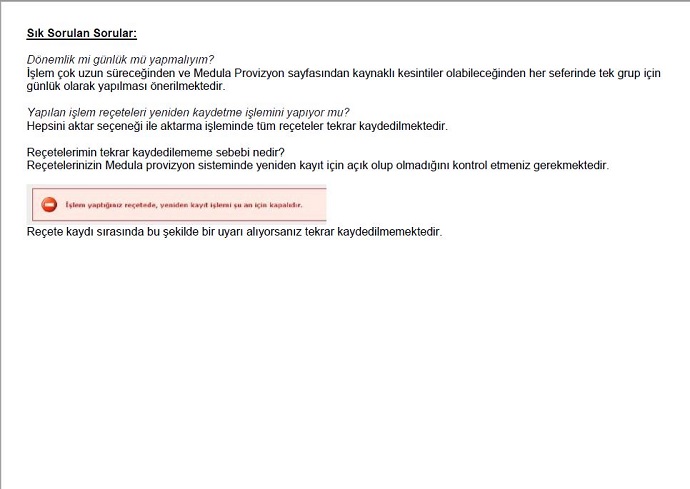 Halihazırda sisteme kaydedilmiş olan reçetelerin çağrılarak yeniden kaydedilmesi işlemleri için gerekli düzenlemeler Medula Eczane Provizyon Sisteminde 15.05.2019 Çarşamba günü akşam saati itibariyle tamamlanmış olup, sisteme kaydedilmiş reçetelerin çağrılarak, yeni düzenlemelere uygun şekilde yeniden kaydedilmesi işleminin gün içerisinde yapılması rutin işlemleri etkileyebileceğinden; reçete çağırma ve yeniden kaydetme işlemlerinin hergün saat 17:00 den sonra yapılacak şekilde planlandığı bilgisi alınmıştır.