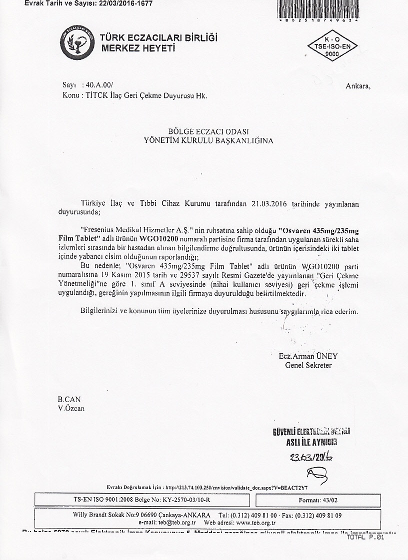Türkiye İlaç ve Tıbbi Cihaz Kurumu tarafından 21.03.2016 tarihinde yayınlanan duyurusunda, " Fresenius Medikal Hizmetler A.Ş." nin ruhsatına sahip olduğu " Osvaren 435 mg/235 mg. Film Tablet" adlı ürünün WGO10200 numaralı partisine firma tarafından uygulanan sürekli saha izlemleri sırasında bir hastadan alınan bilgilendirme doğrultusunda, ürünün içerisindeki iki tablet içinde yabancı cisim bulunduğu ve bu nedenle de anılan ürünün WGO10200 parti numaralı serisine 1. Sınıf A seviyesinde geri çekme işlemi uygulandığı bildirilmektedir.