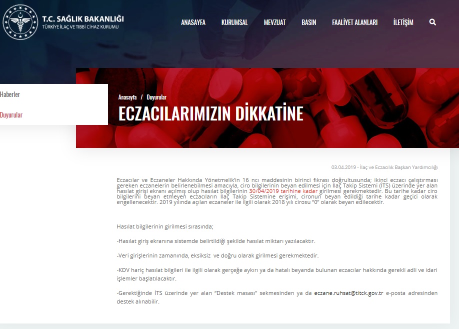 Türkiye İlaç ve Tıbbi Cihaz Kurumu tarafından İlaç Takip Sistemi (İTS) üzerinde yer alan hasılat girişi ekranı açılmış olup 2018 yılı hasılat bilgilerinin 30.04.2019 tarihine kadar girilmesi gerekmektedir.