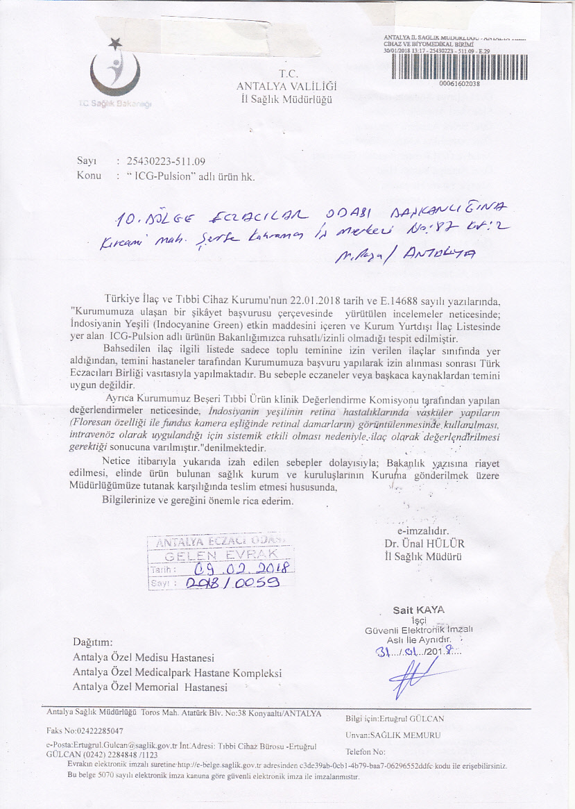 Kuruma ulaşan bir şikayet başvurusu çerçevesinde yürütülen incelemeler neticesinde, İndosiyanin Yeşili ( Indocyanine Green) etkin maddesini içeren ve Kurum Yurt Dışı İlaç Listesinde yer alan ICG-Pulsion adlı ürünün Bakanlık tarafından ruhsatlı/izinli olmadığının tespit edildiği,